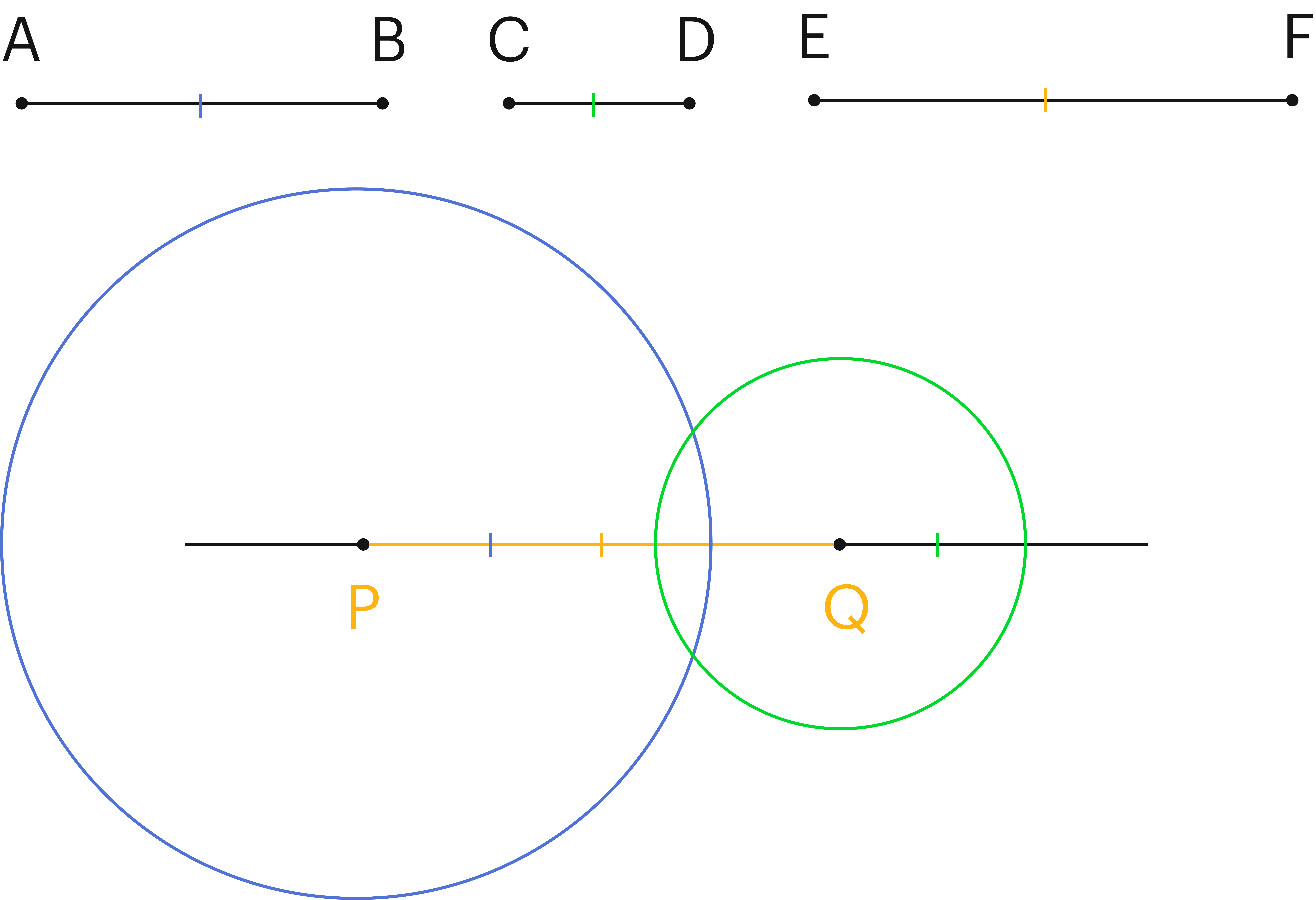 Получившиеся окружности пересекаются в точке S, тогда треугольник который нам нужно было построить SPQ. PS = AB,SQ = CD,PQ = EF