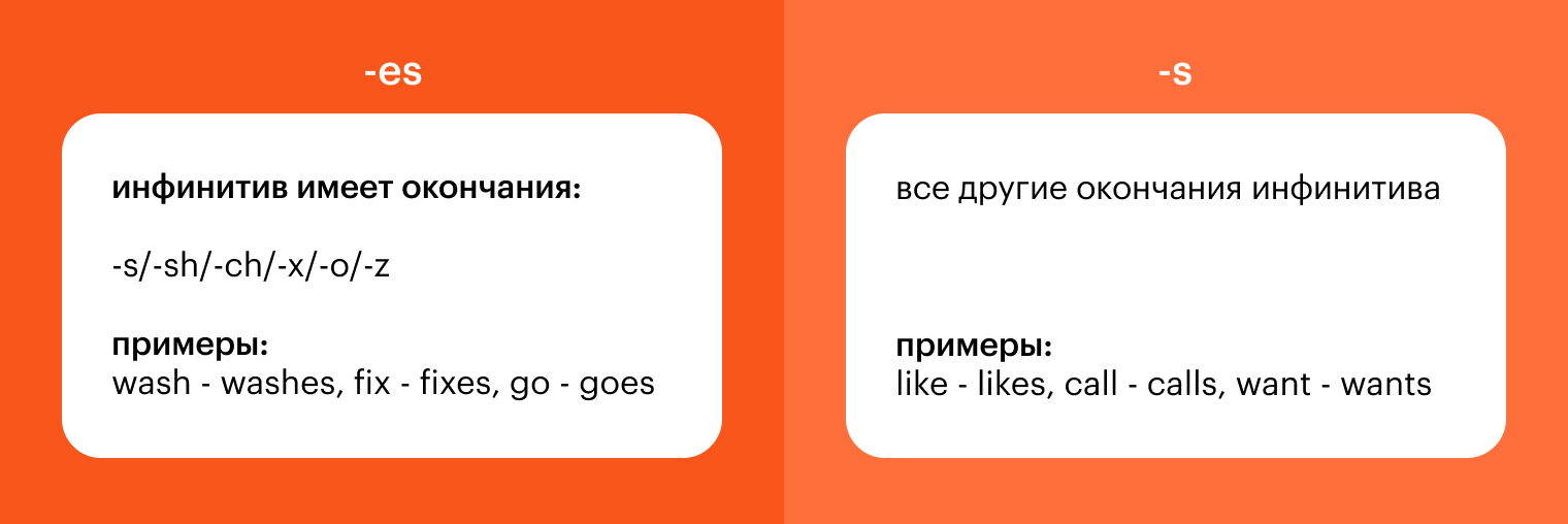 Для третьего лица единственного числа (he, she, it) мы добавляем скромное -s или -es к окончанию глагола. Ну, как будто мы за их спиной шепчемся с неловкой помаркой «тссс».