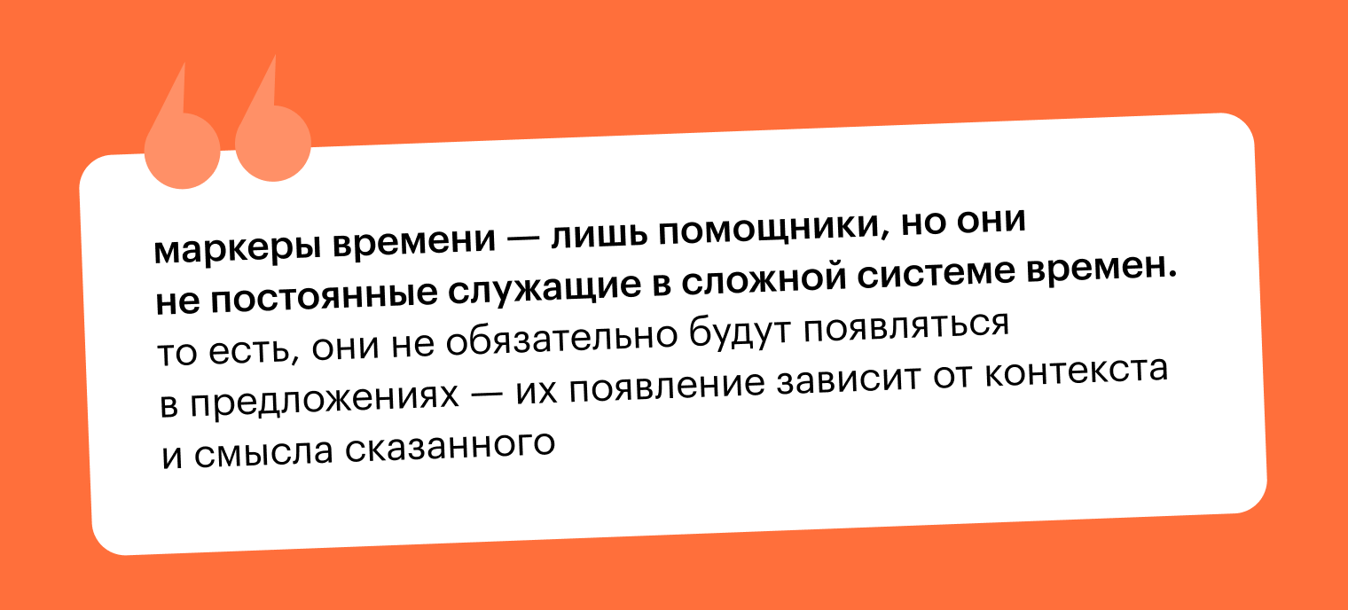 Маркеры времени — лишь помощники, но они не постоянные служащие в сложной системе времен. То есть, они не обязательно будут появляться в предложениях — их появление зависит от контекста и смысла сказанного.