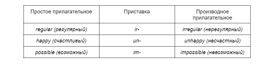 Для образования прилагательных из этой группы нам потребуются аффиксы, то есть приставки и/или суффиксы.