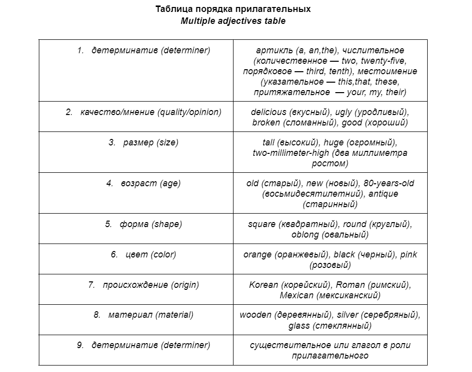Из примера выше мы видим, что в предложении может быть больше одного прилагательного.
