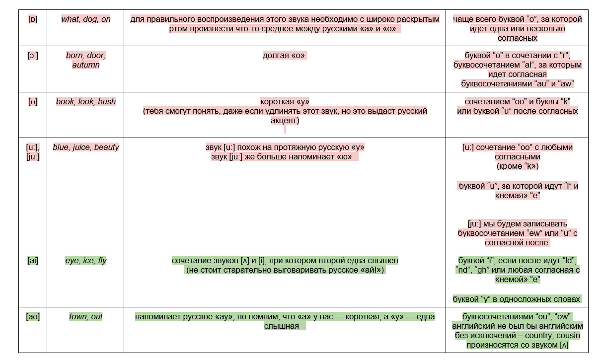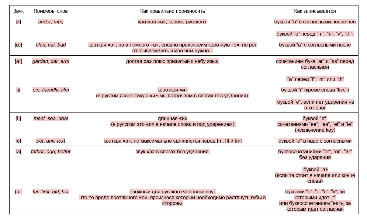 Без правильного произношения, грамотно говорить по-английски не получится. Поэтому мы составили специальную таблицу-шпаргалку. В неё входят все гласные звуки, с примерами, объяснением произношения и особенностями записи.