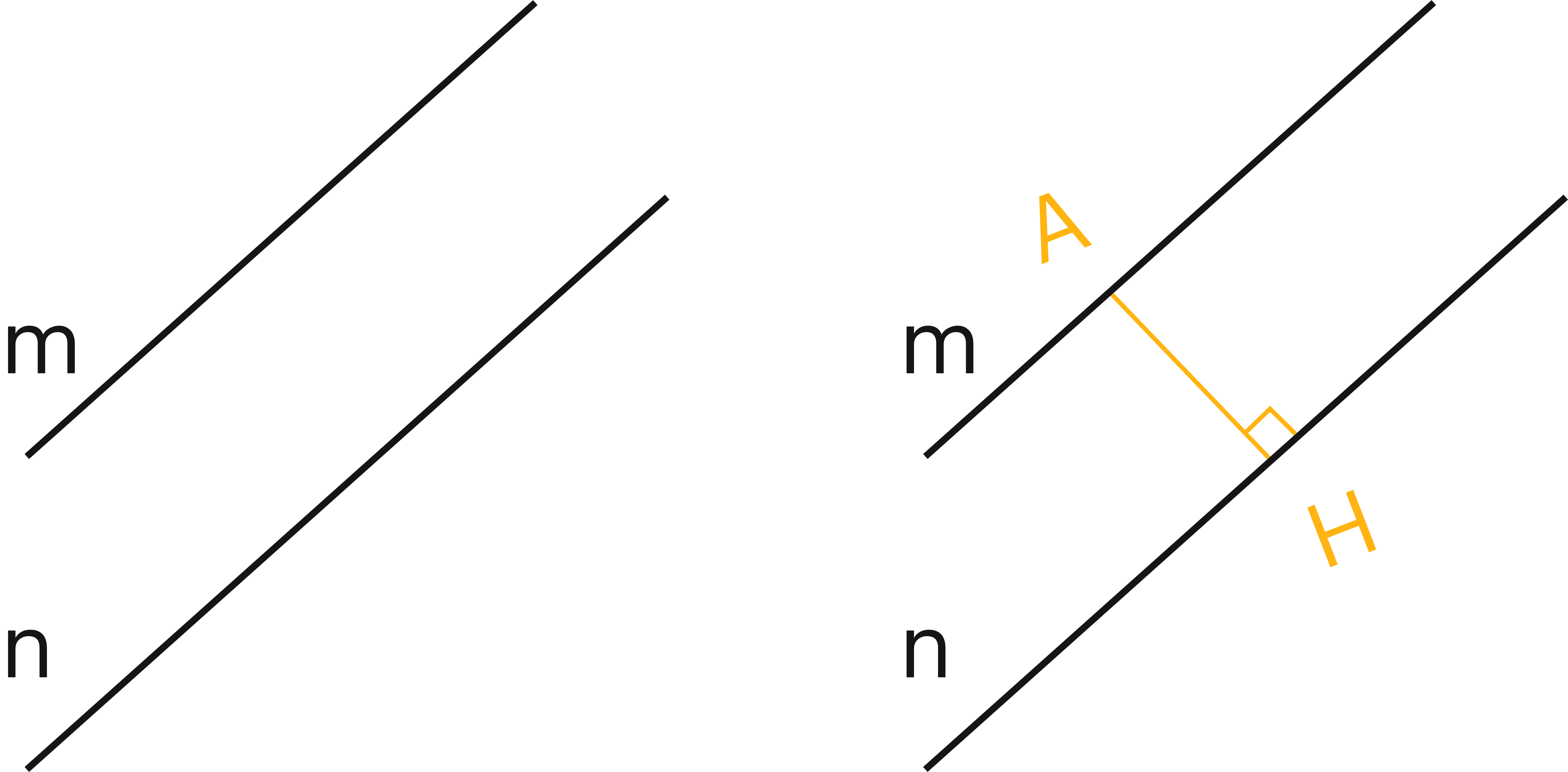 Пользуясь тем, что расстояние от точки до прямой — это перпендикуляр, проведенный из этой точки к прямой, можно сделать вывод что расстояние между прямыми m и n равно длине отрезка AH