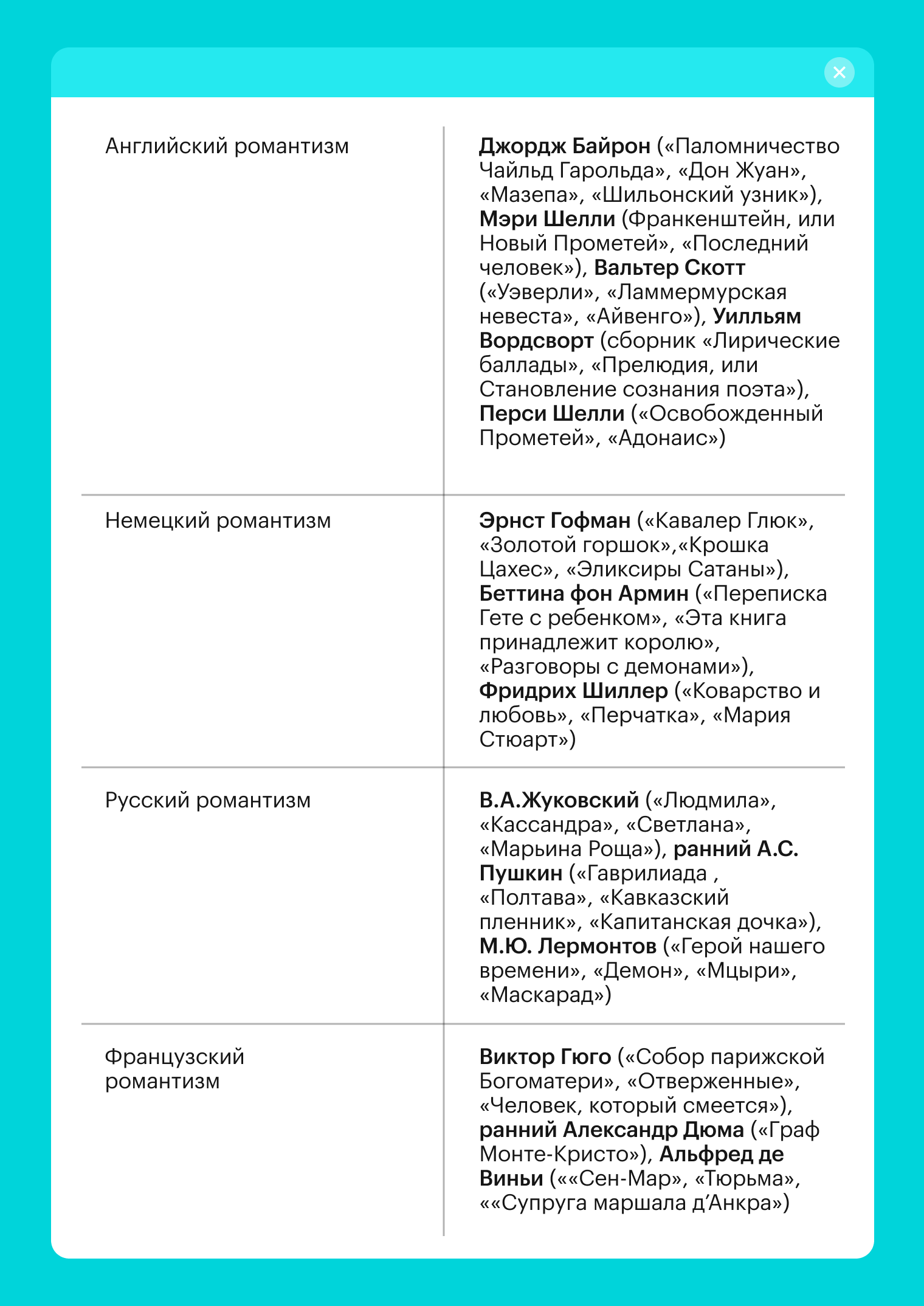 Романтизм оказал большое влияние на всю европейскую литературу своего времени. В каждой стране был свой романтизм, созданный под влиянием национальных черт и культурного контекста. Постараемся кратко обозначить отличительных деятелей: