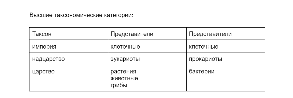 Высшие таксономические категории можно посмотреть в таблице ниже.