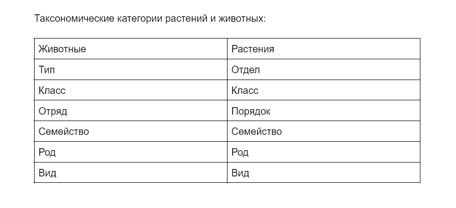 Таксономические категории растений и животных расположены в таблице ниже.