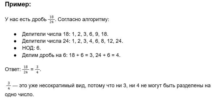 Например, если мы видим числитель 24 и знаменатель 72, у них будет несколько общих делителей: 2, 4, 6, 8, 12, 24. Но если мы разделим числитель и знаменатель на 8, мы получим дробь 3/9, которую можно будет дальше сокращать. Так что нам надо выбрать наибольший делитель — 24, чтобы получить 1/2 в результате сокращения.