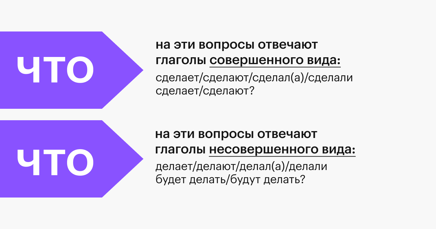Если по контексту сложно определить вид, мы начинаем задавать вопросы к глаголу. Вот небольшая шпаргалка: