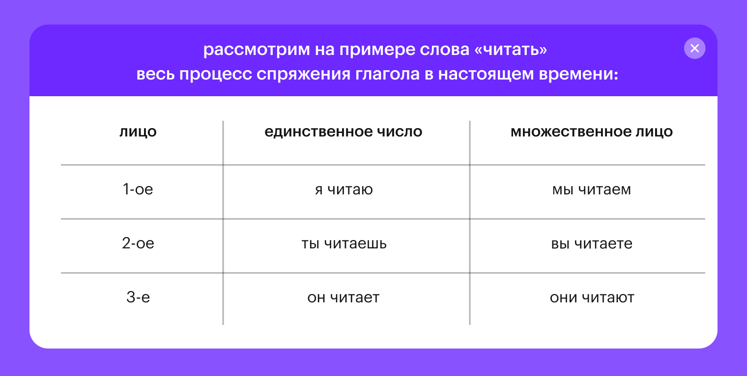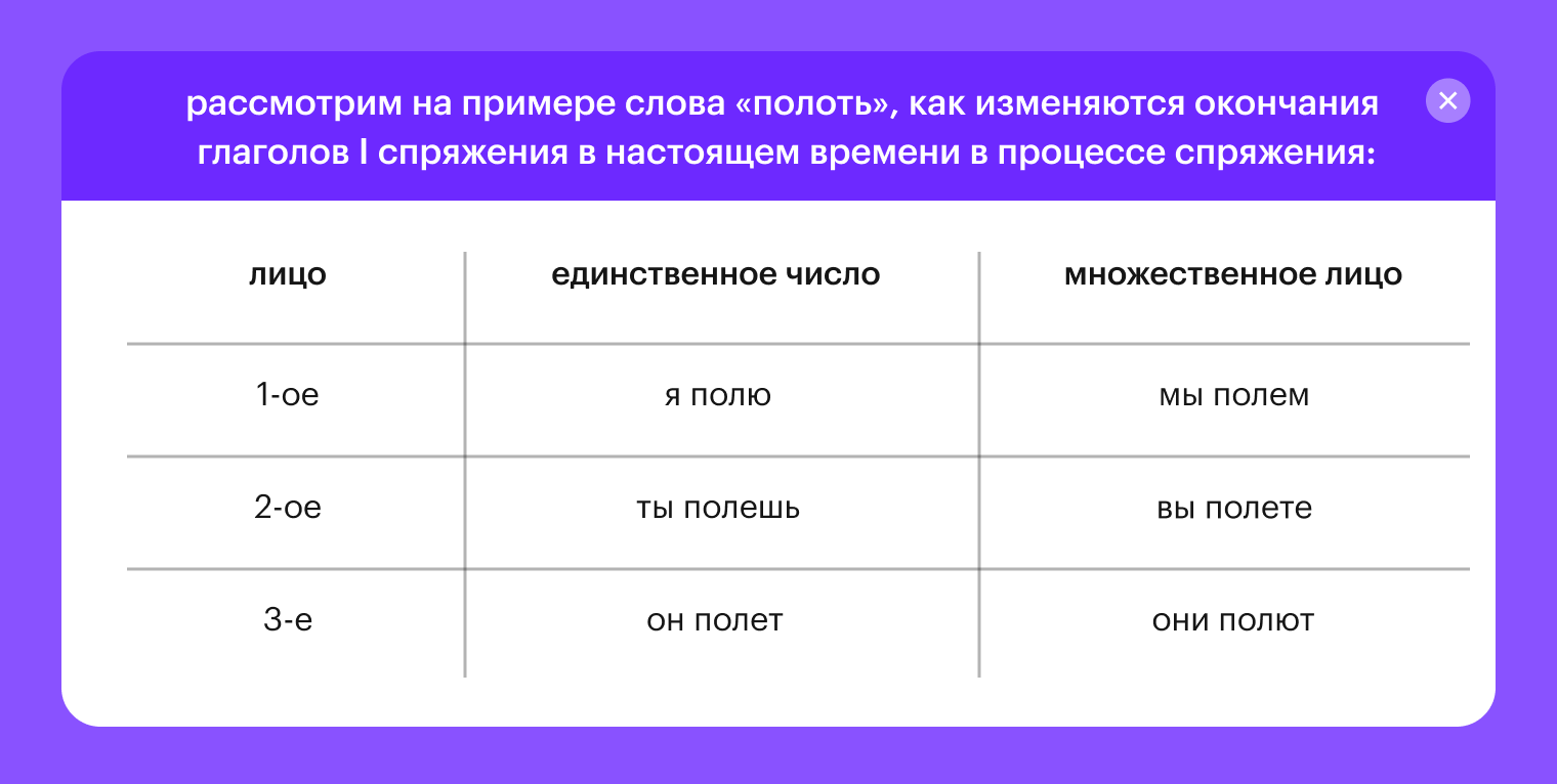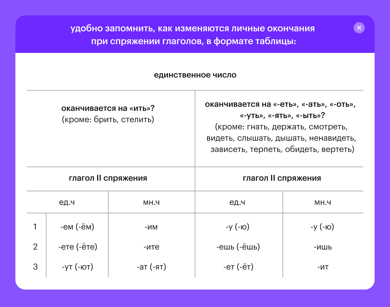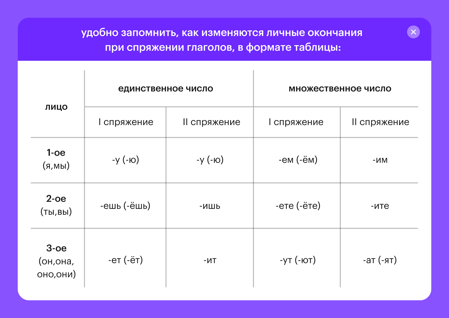 Удобно запомнить, как изменяются личные окончания при спряжении глаголов, в формате таблицы: