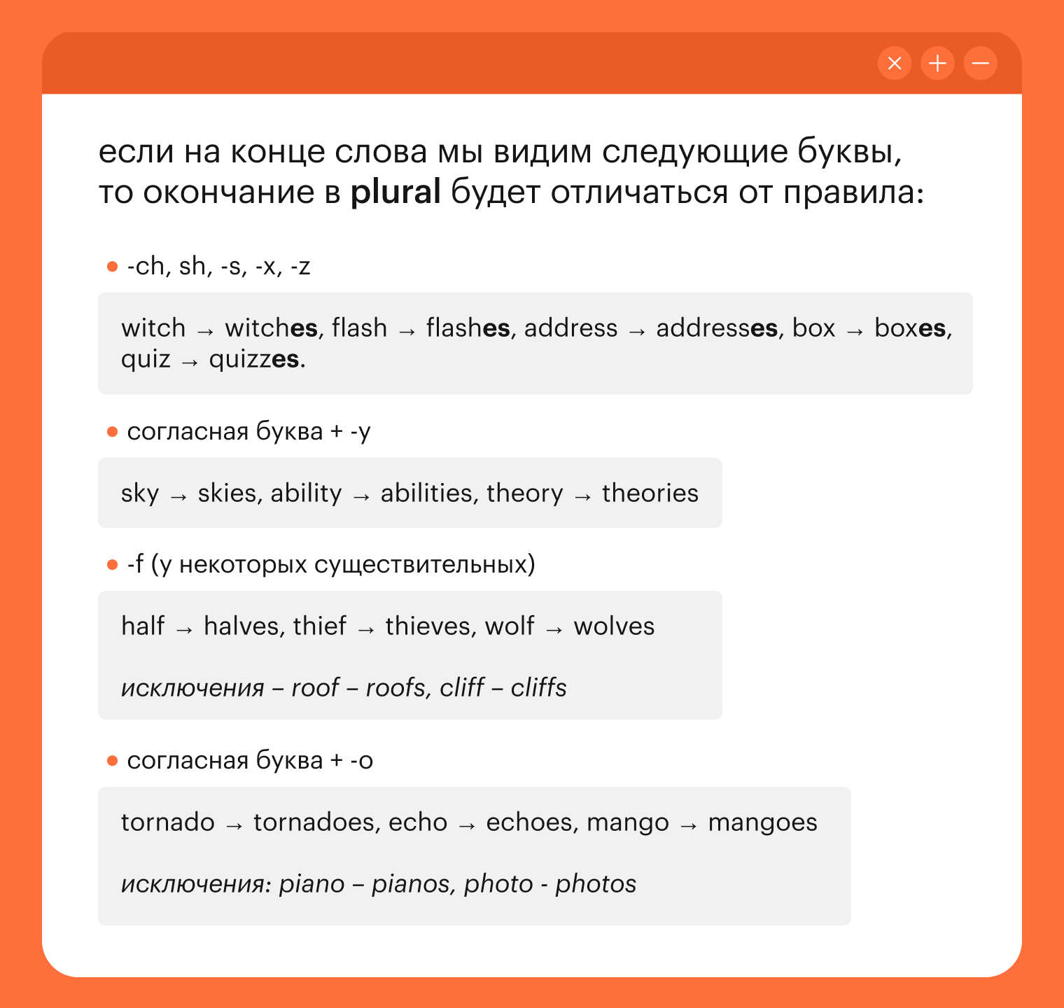 Для большинства существительных форма множественного числа образуется при помощи простого добавления -s на конце слова. Однако есть несколько исключений, связанных с «особыми» окончаниями некоторых представителей этой части речи. Так, если на конце слова мы видим следующие буквы, то окончание в plural будет отличаться от правила. Смотри картинку ниже.