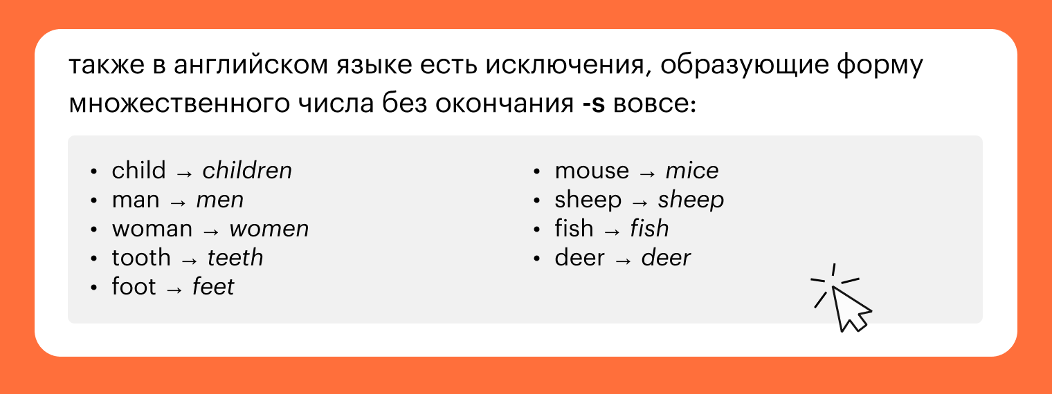 Также в английском языке есть исключения, образующие форму множественного числа без окончания -s вовсе.