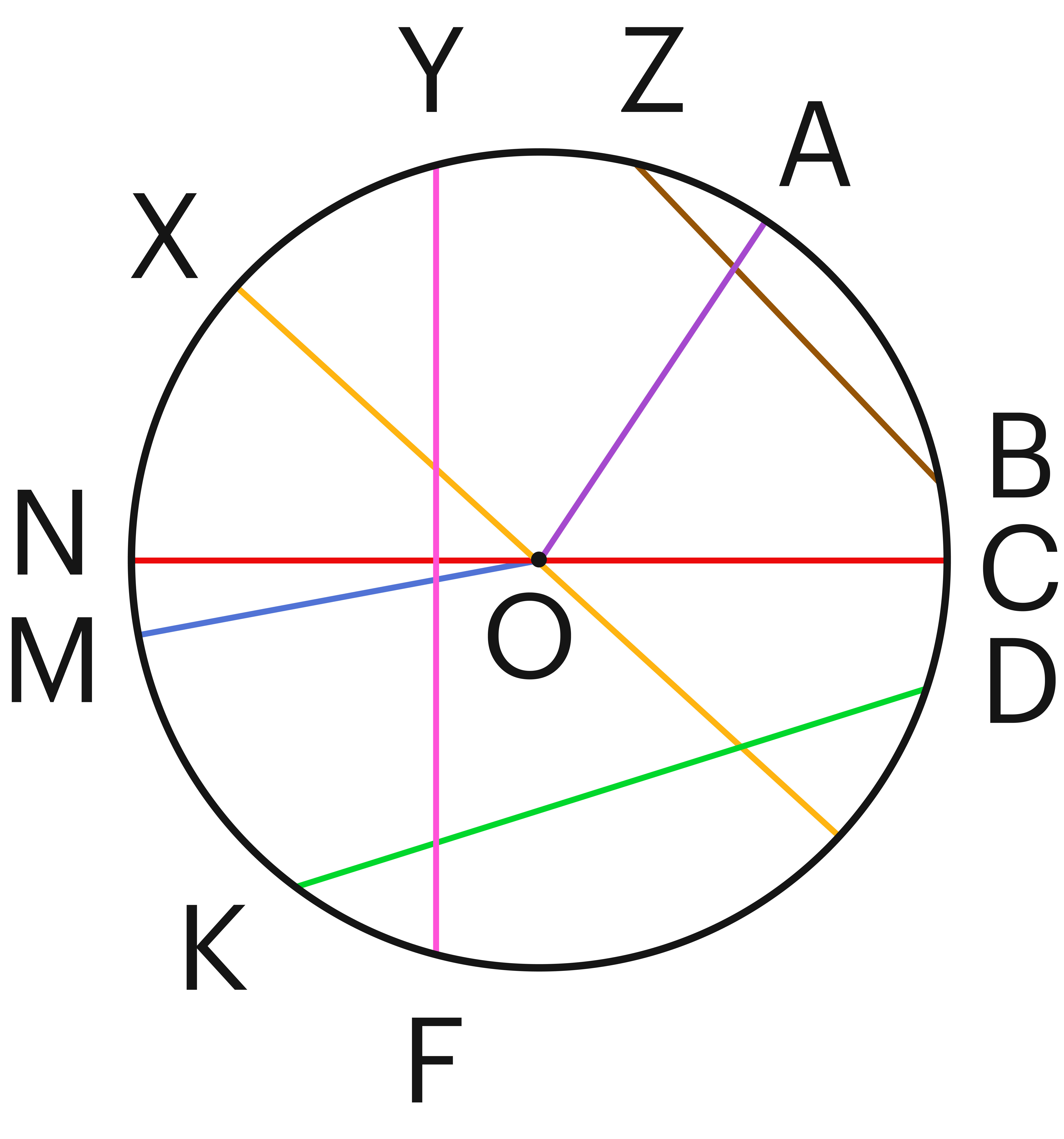 Определите какие отрезки являются радиусом, диаметром и хордой