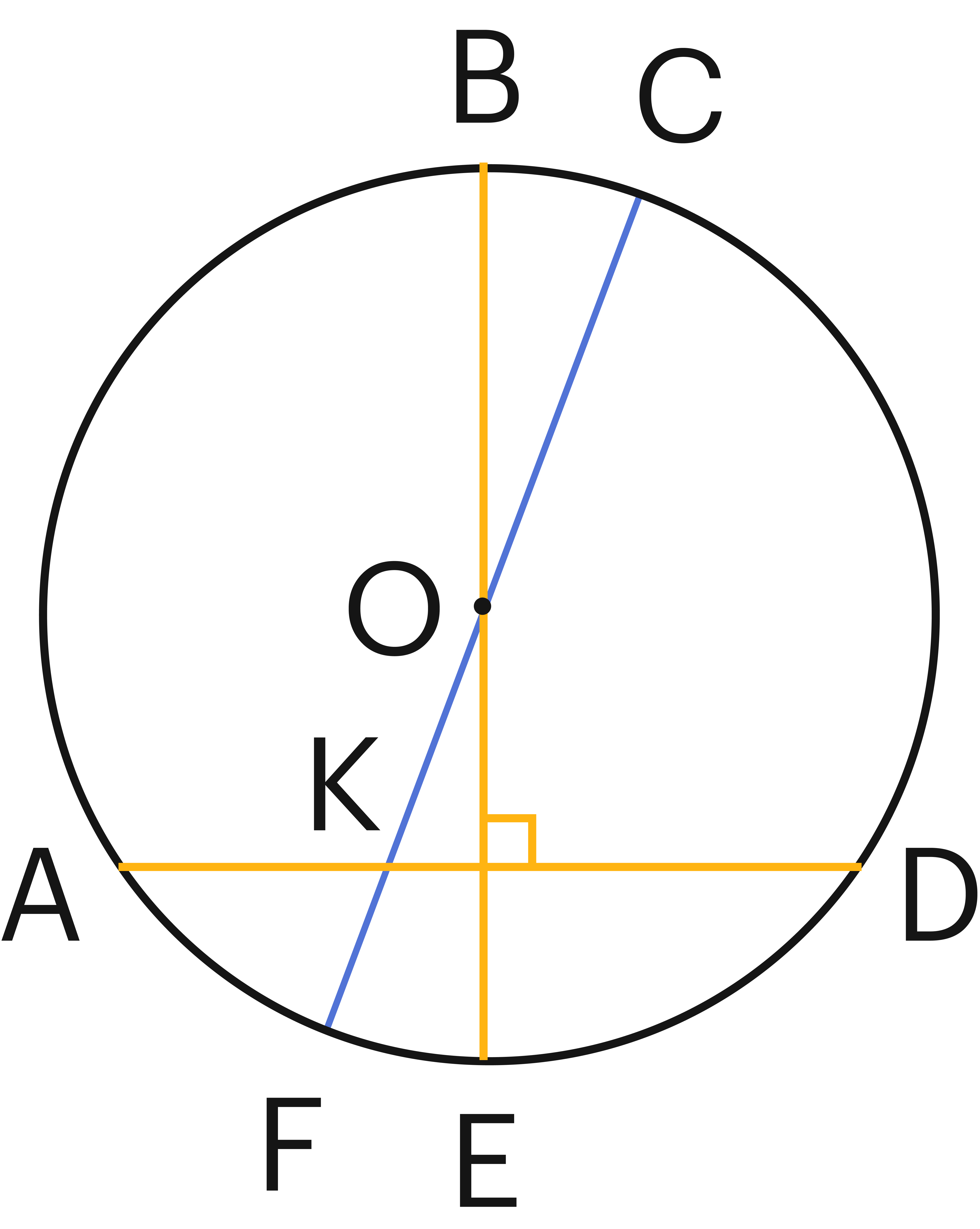 Доказательство: рассмотрим диаметр CF, проходящий через точку K, которая является серединой хорды. По доказанному выше можно сказать, что CF⊥ AD. Тогда диаметры CF и BE совпадают, поэтому диаметр BE делит хорду пополам