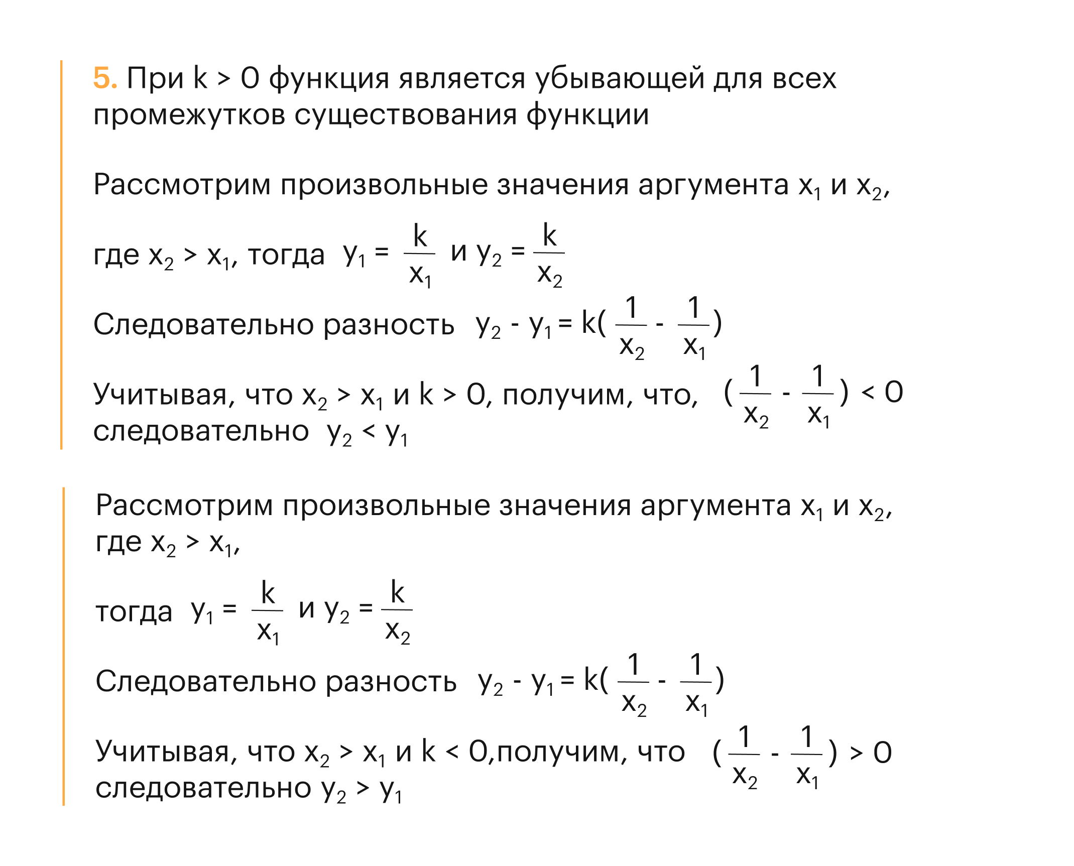 Содержимое блока: 5. При k > 0 функция является убывающей для всех промежутков существования функции