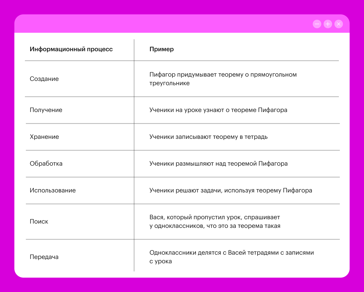 То есть информатика подразумевает, что с информацией обязательно производят какие-то действия. Действия, которые производят с информацией, называют информационными процессами.