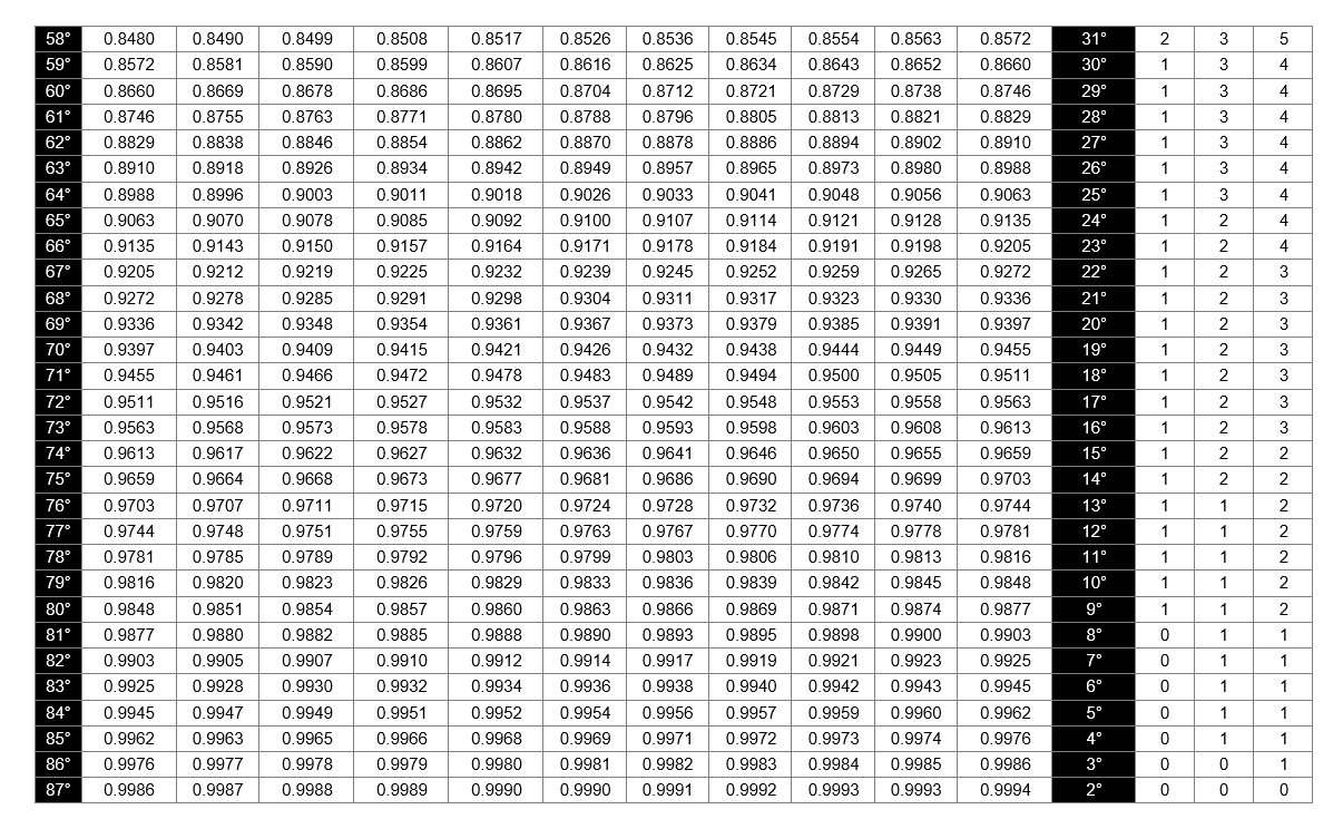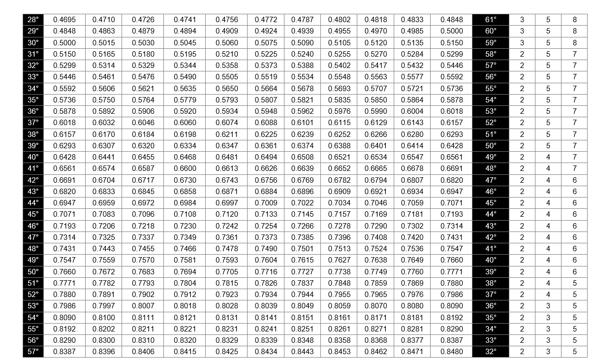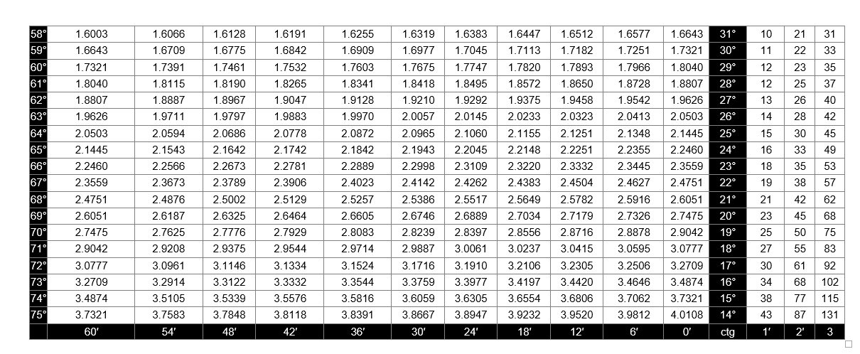 Достаточно просто найти нужный угол - и результат готов. Полная таблица состоит из значений синуса, косинуса, тангенса и котангенса, ей можно пользоваться онлайн, а можно скачать и распечатать.