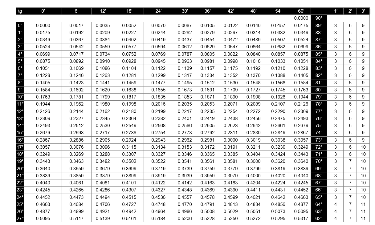 В этой таблице собраны все значения для тангенсов и котангенсов углов.