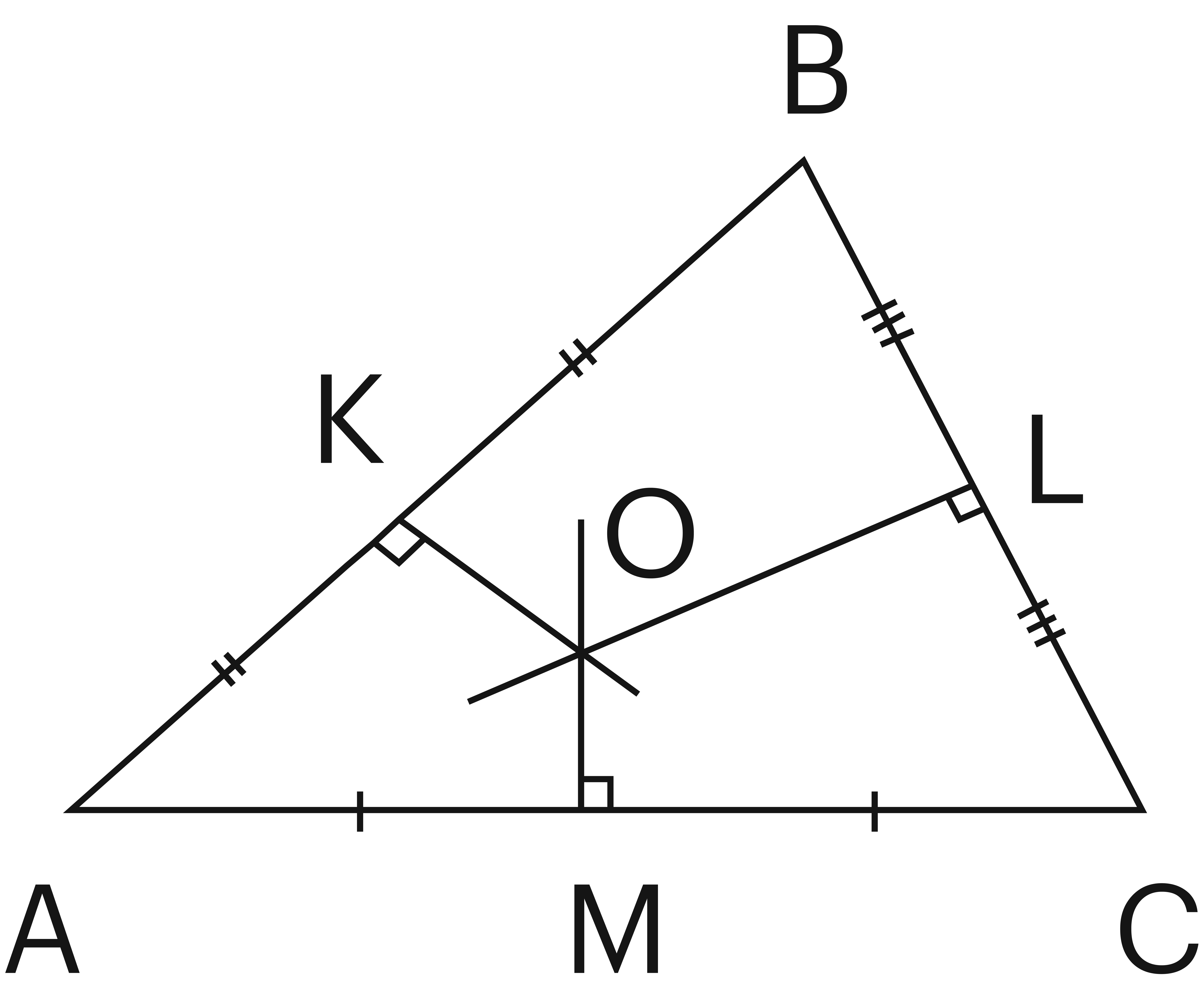 Следствие 2. Серединные перпендикуляры к сторонам треугольника пересекаются в одной точке.