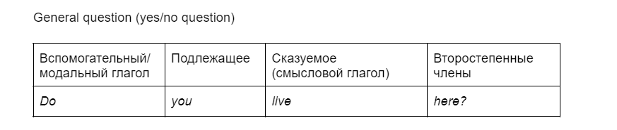 General question (yes/no question) начинается со вспомогательного или модального глагола, за ним следует комбинация подлежащее + сказуемое, а уже после них — все остальные члены предложения.