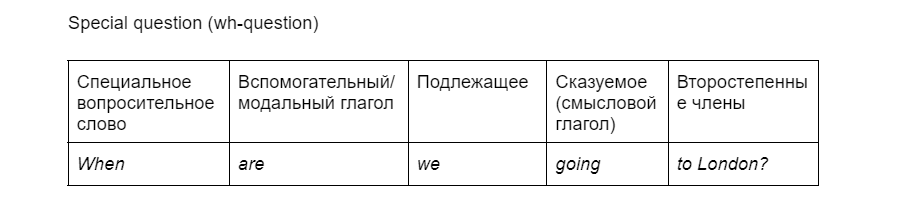 Идем дальше — в special question (wh-question) примерно такой же принцип, только перед всей этой комбинацией добавляется еще и специальное вопросительное слово.