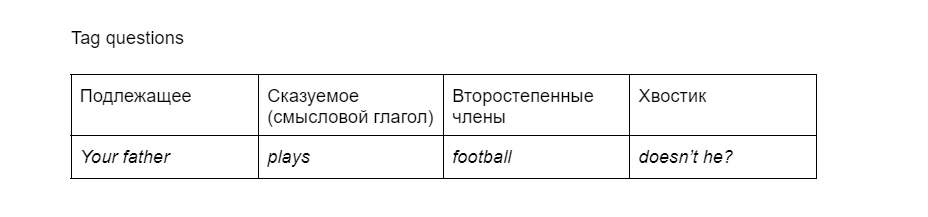 Ну и последняя категория — tag questions. Для их построения нам понадобится структура обычного утвердительного (или отрицательного) выражения и так называемый хвостик «не так ли?».