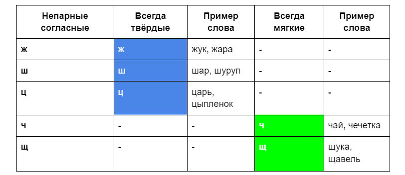 Согласные звуки могут быть парными и непарными по твердости и мягкости. Парные согласные имеют как твердый, так и мягкий вариант. Например, «б» и «бь» – это парные согласные. Непарные же согласные всегда твердые или всегда мягкие. Например, «ж» и «ш» – всегда твердые, а «ч» и «щ» – всегда мягкие. Давай посмотрим таблицу с примерами. Твердые согласные выделены синим цветом, а мягкие — зеленым: