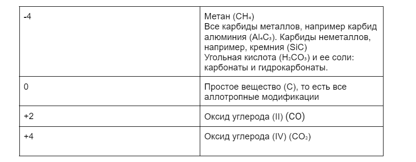 Степеней окисления тоже будет несколько: -4 до +4. Ниже в таблице приведены примеры соединений.