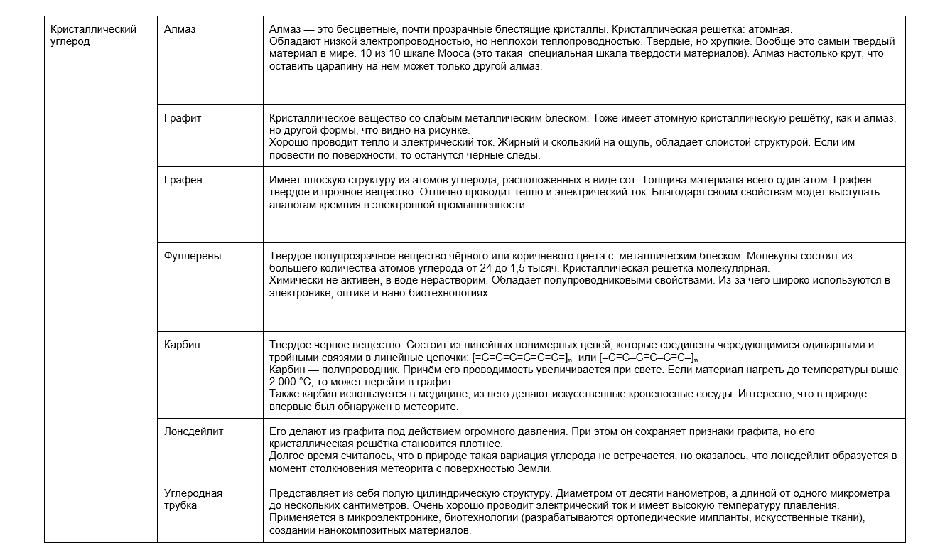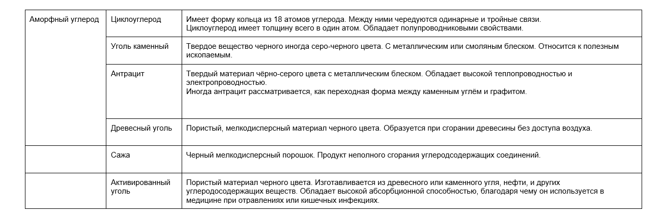 Углерод неметалл, а как и большинству неметаллов ему свойственна аллотропия. Самыми популярными природными аллотропными модификациями будут алмаз, графит, уголь, антрацит. Некоторые вариации можно получить только искусственно. Ниже в таблице рассмотрим особенности разных видов углерода.