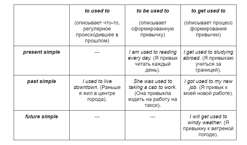 Если все еще сомневаешься, в каких временах и формах можно использовать used to – воспользуйся нашей небольшой таблицей-шпаргалкой.
