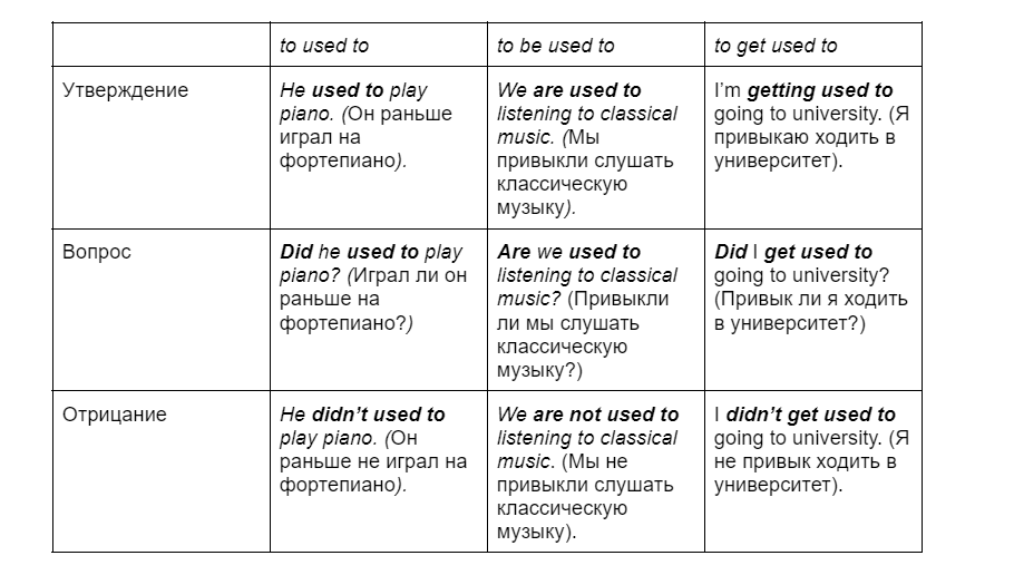 С конструкциями used to также возможно построить вопросительные и отрицательные предложения. Посмотреть, как составлять такие предложения можно в таблице ниже.