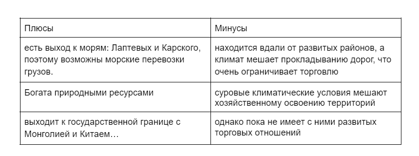 Плюсы и минусы экономико-географического положения Восточной Сибири — в таблице.