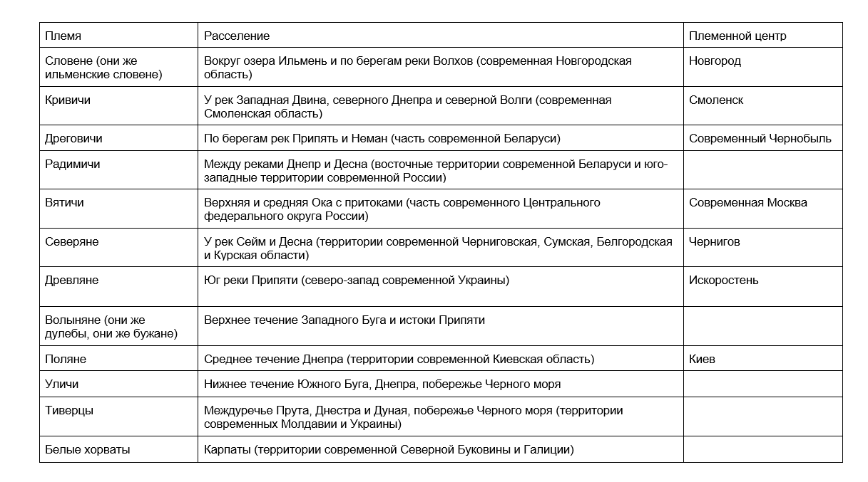 Племена восточных славян жили в “вакууме”. Они постоянно взаимодействовали друг с другом и с соседями путем торговли, дипломатии и военных походов. Карта расселения восточных славян занимает территории современных России, Украины и Беларуси, но тогда представлений о национальности еще не существовало - человек относил свою принадлежность именно к племени.