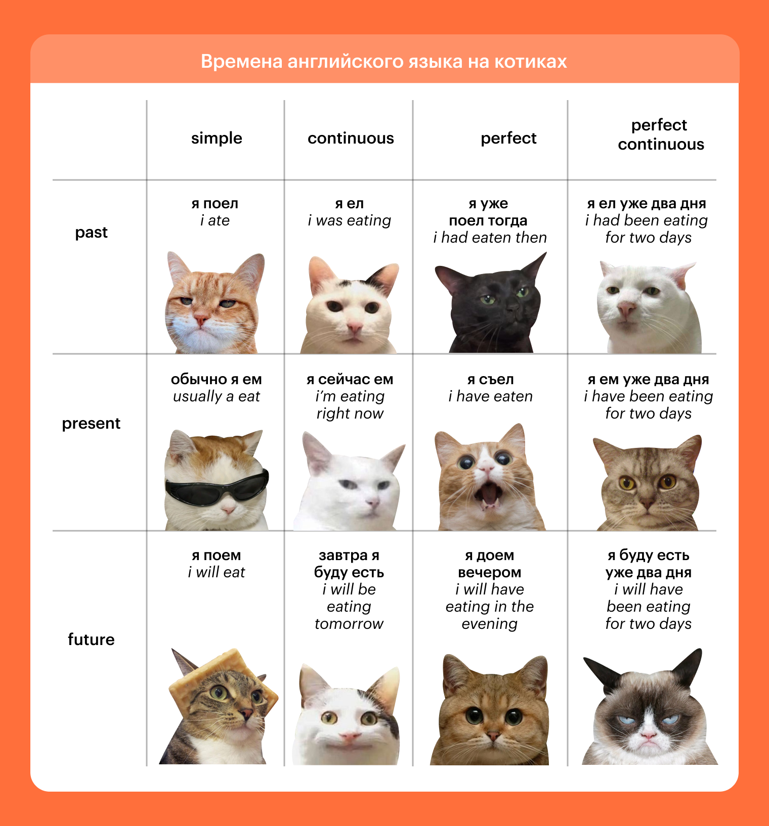 Времена английского языка на котиках, чтобы проще запомнить: